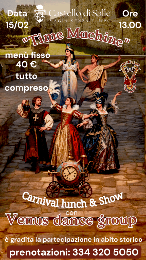 Un Carnevale multiepoca nel Castello di Salle: danze storiche, costumi d’epoca, pranzo spettacolo e un viaggio tra Antico Egitto, Roma antica, Medioevo, Rinascimento e Barocco con il gruppo Venus. Un’esperienza culturale unica in Abruzzo.